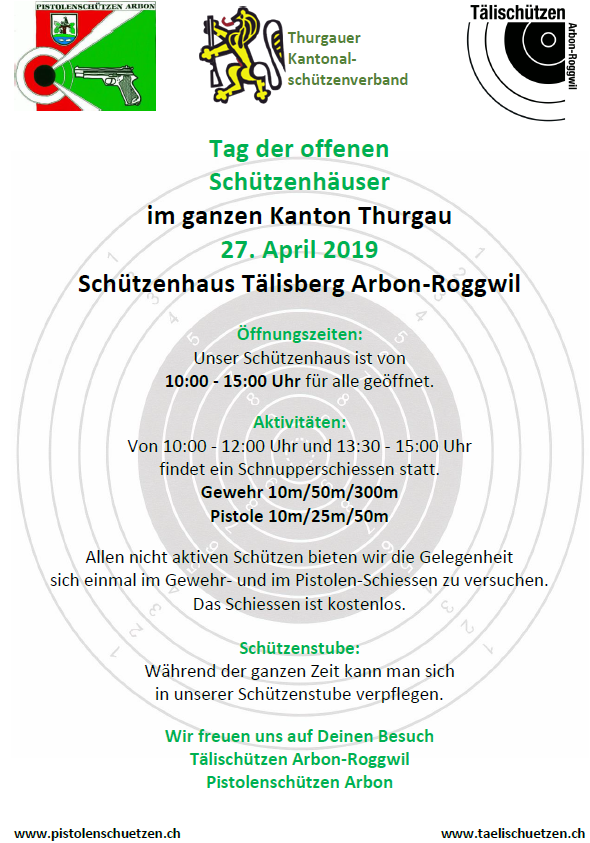 Im ganzen Kanton Thurgau machen am Samstag 27. April 2019 viele Vereine mit am Tag der offenen Schützenhäuser. Wir Tälischützen sind natürlich auch dabei und führen den Anlass mit den Pistolenschützen zusammen auf dem Tälisberg durch.