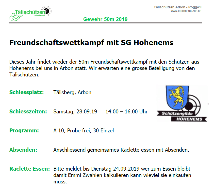 29. September 201929. September 2019Michael Allenspach Freundschaftswettkampf mit Hohenems, Samstag 28.09.2019 Rangliste Arbon-Hohenems 2019 Max unser ältestes Mitglied Wolfram Waibel zeigt sein Können Sitzend aufgelegt…. Der Wanderpreis bleibt wieder einmal in Arbon… Woher kommt die Dame? Nach dem Schiessen das gemeinsame Raclette-Essen…