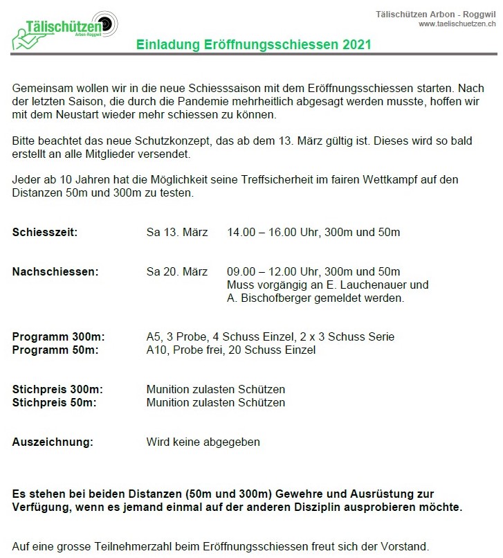 28. Februar 20211. März 2021Michael Allenspach Eröffnungsschiessen Samstag 13. März 2021 Einladung Eröffnungsschiessen 2021